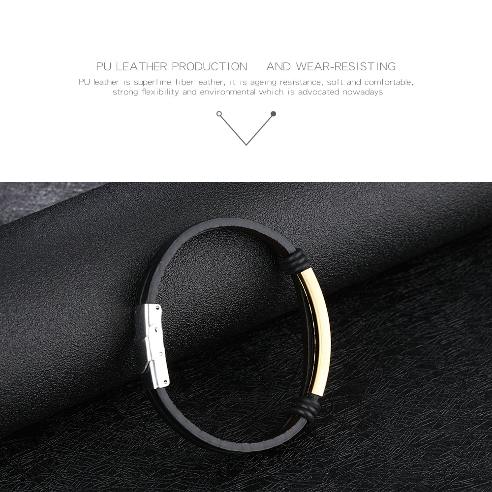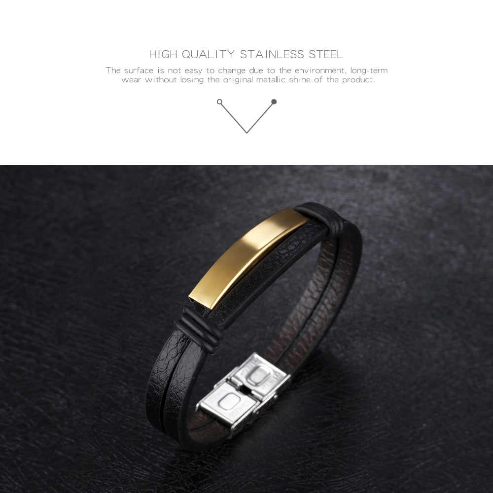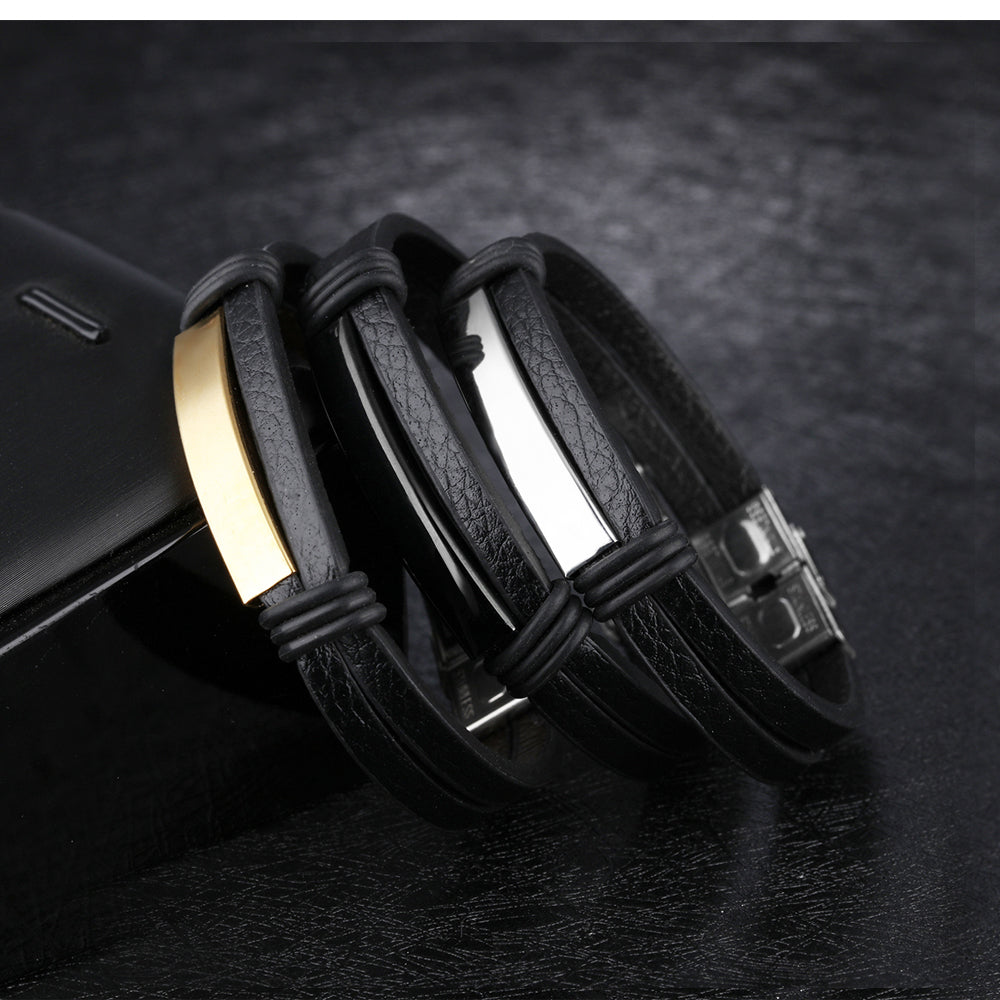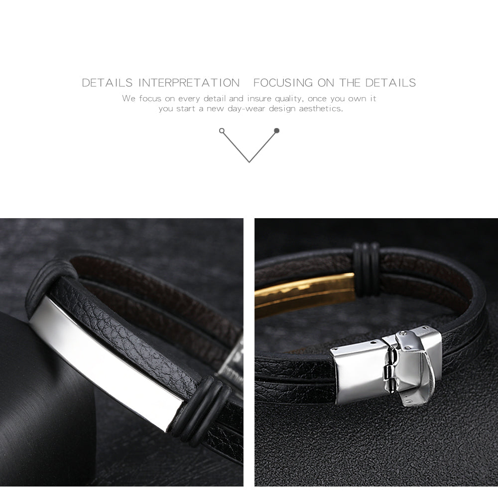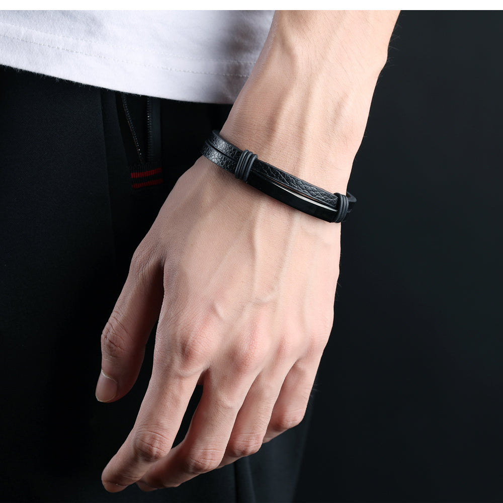 Black Stainless Steel Men's Leather Bracelet Double Layer Bracelet