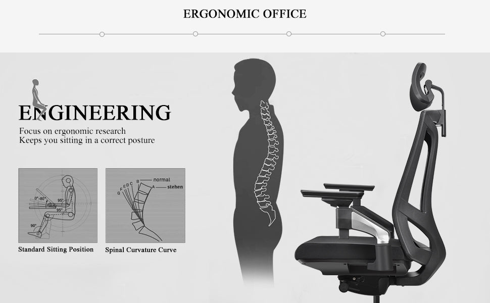 - Ergonomic design: The design is based on the dynamic digital model of the human body and the biomechanical data of the sitting posture, which fits the four physiological curvatures of the human spine, the S-shaped bionic curve backrest, maintains the healthy shape of the spine, and scientifically guides the spine activity. Provide 4 support points (head/back/shoulder/waist), which can be adjusted according to the stress point to meet different needs.